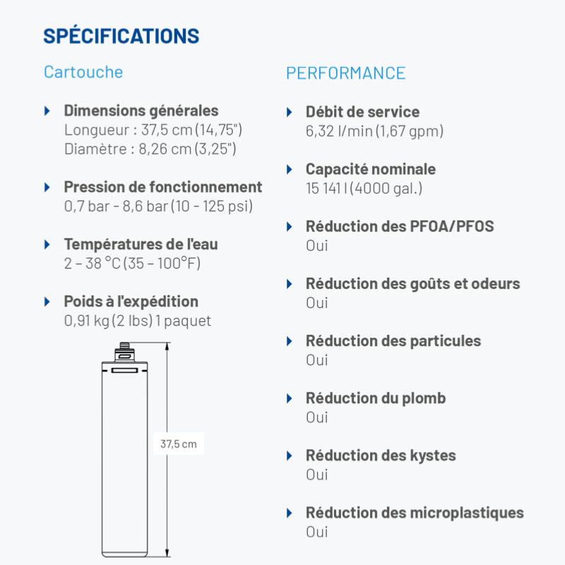 La cartouche de filtration d'eau 4FC-P, dotée du média exclusif Fibredyne™, est conçue pour réduire les PFOA/PFOS, le chlore, les goûts et odeurs, le plomb, les microplastiques et les particules. Ces caractéristiques contribuent à garantir la fiabilité et la longévité des performances de l'équipement. Le système utilisant cette cartouche peut maintenir un débit de 6,32 l/min pour plus de 15 000 litres.