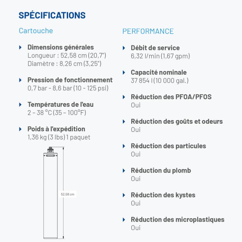 La cartouche de filtration d'eau 7FC-P, dotée du média exclusif Fibredyne™, est conçue pour réduire les PFOA/PFOS, le chlore, les goûts et odeurs, le plomb, les microplastiques et les particules. Ces caractéristiques contribuent à garantir la fiabilité et la longévité des performances de l'équipement. Le système utilisant cette cartouche peut maintenir un débit de 6,32 l/min pour plus de 37 800 litres.